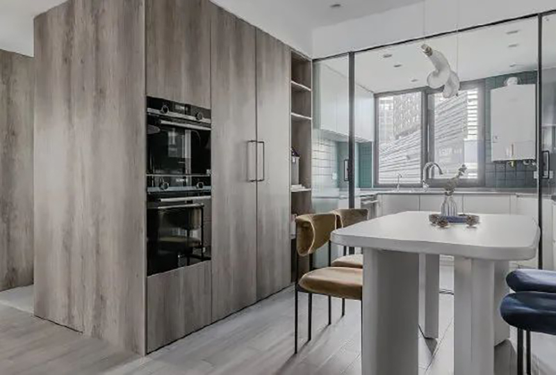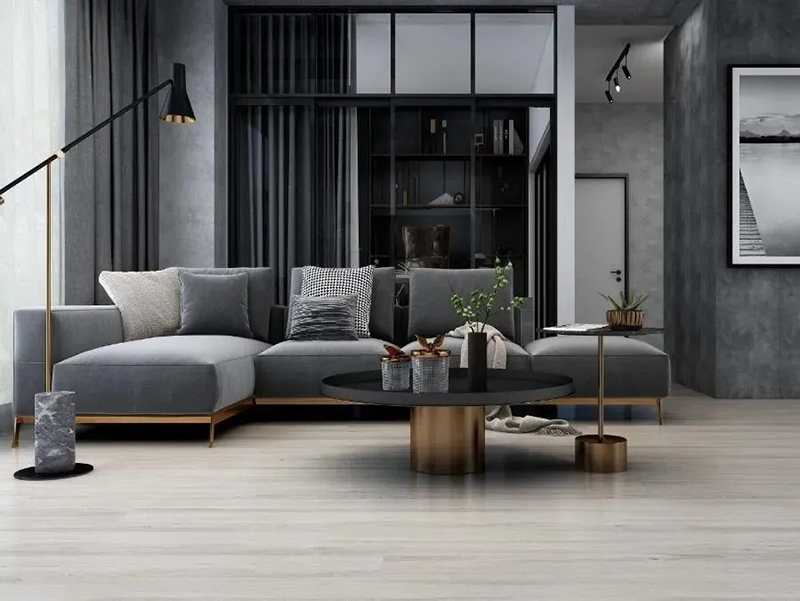 在很多时尚的年轻人的家中,选择高级灰呈现一个家的面貌,是一种非常新颖的做法,灰色系地板时尚低调,突破木色调刻板的限制,又让空间曲线更柔和,质感更舒适。